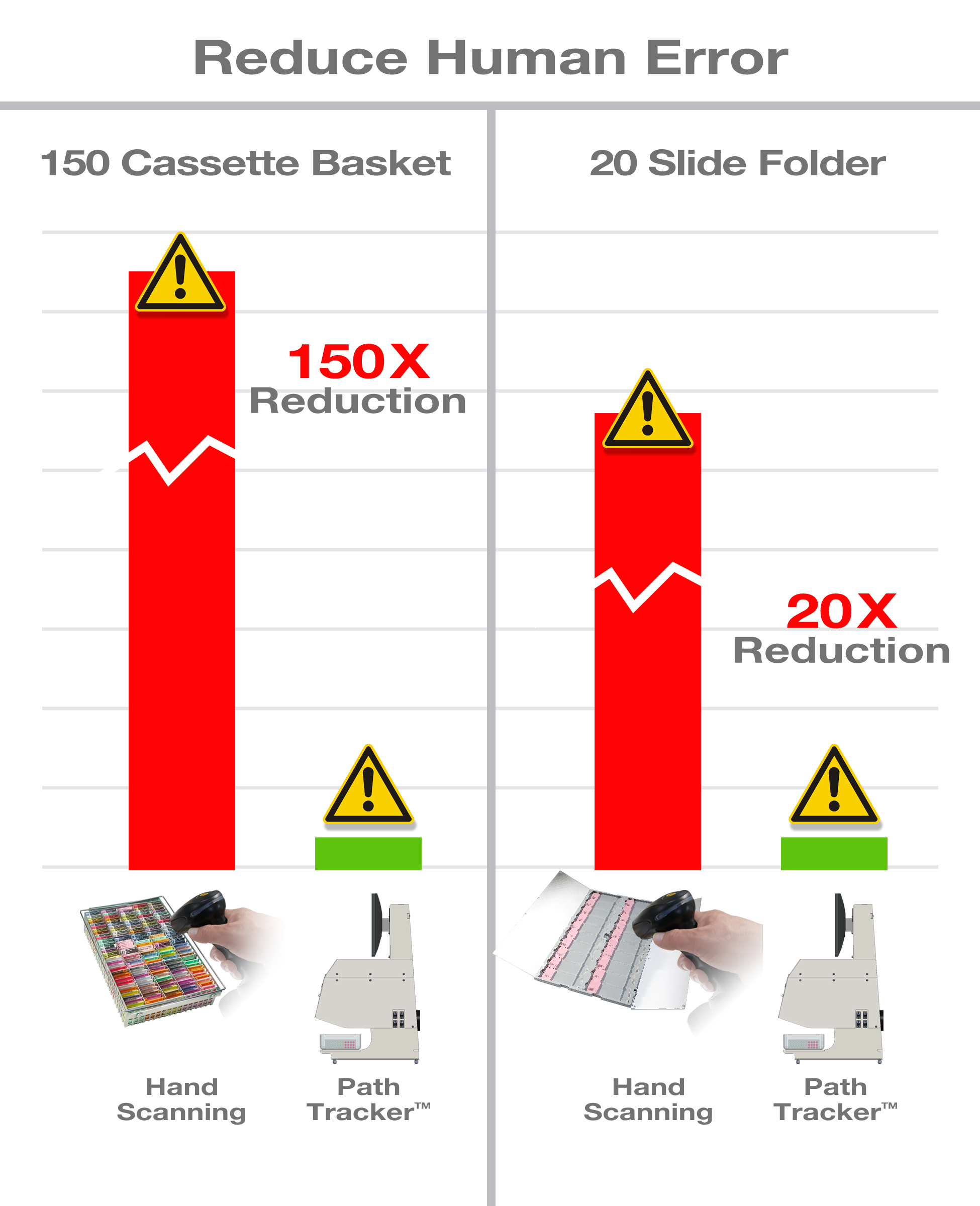 Critically, PathTracker’s visual interfaces shows you an image of the scanned samples with all the scanned barcodes marked. Unscanned cassettes are easily identified and quickly addressed using PathTracker’s correction tools ensuring your production run continues with its processing. During reconciliation scans, immediate notification is provided for missing samples ensuring issues are addressed in timely fashion.